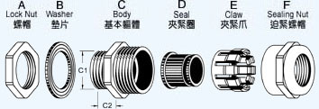 ·产品材质: A.C.F部分以锌合金镀镍制成,E部分以UL认可之尼龙PA66制成(防火等级UL94V-2),B及D部分采用EPDM耐候橡胶制成。